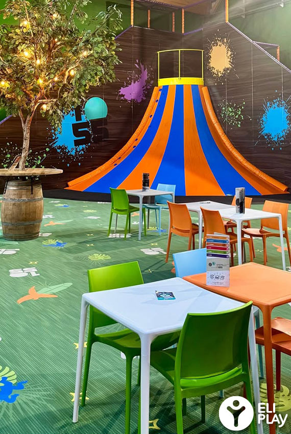 Le volcano est fait d’une structure en acier, sur laquelle est tendue une toile de vinyle. Des prises sont fixées sur les paroies du volcan pour en faciliter l’ascension. Les enfants peuvent ensuite redescendre via un toboggan. La base du volcan est garnie d’un tapis amortissant et antidérapant.